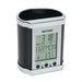 "Smart cup" pencil holder features a unique front panel with LCD display that shows time date month year and temperature (in Celsius or Fahrenheit). Also includes a convenient alarm clock to remind you of appointments. Pencil Cup Type: LCD Display Color(s): Black/Chrome Material(s): Plastic Width: 3 1/2 in.Unit of Measure : Each