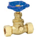 1/2 inch compression, brass, lead free, stop valve Plus drain cap, heavy brass construction, 5/8 inch od, large flow area, heavy cast iron handle, neoprene seal disc, compression ends for solderless connection to copper tubing, for use with water, oil or air.